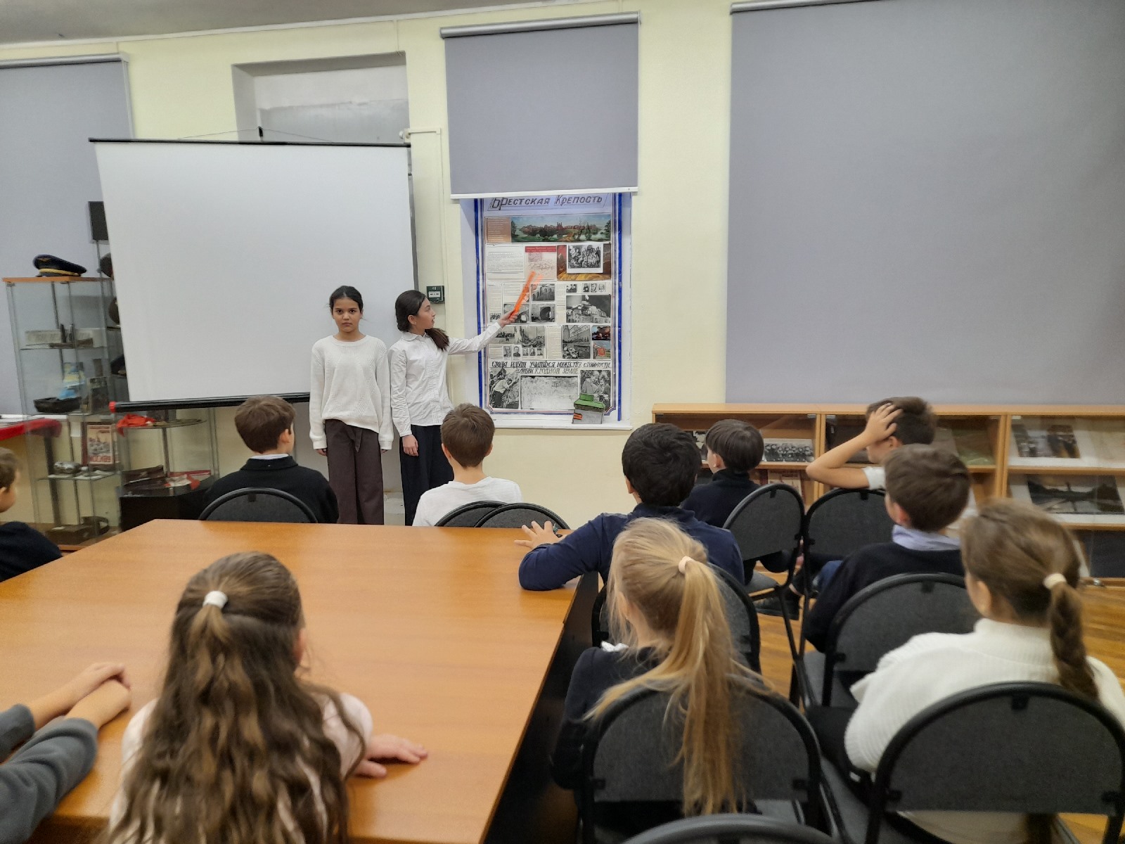 В мероприятии приняли участие ученики 3Д класса. Учащиеся: Аиша Х. , Марям Н., участники кружка «Клуб экскурсоводов в школьном музее», рассказали ребятам о начале ВОВ, о подвиге защитников Брестской крепости в июне – июле 1941г.